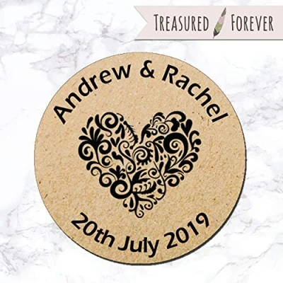 35 x Personalised Wedding Shabby Brown Kraft Effect Favour Round Stickers (35mm) Hearts (Design 1 Black)