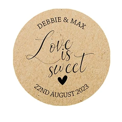 35 Personalised Love is Sweet Wedding Round Stickers. Printed on A4 Sheets - Can be personalised with two names (first names only) and the Date. Lovely finishing touch to your presents. A Lovely way to make your event that extra bit special! Individual sticker size is approximately 3.7 cm. Good quality, professionally designed labels, to make your event a little more MAGICAL! Personalisation Information required: Name of the couple and Date. Each sticker sheet (35 stickers) will be printed with the SAME wording so if you require more than one lot of wording please purchase another sheet. Use 'Customize Now' button, add the personalization you require. Select 'Add to Basket' and then Checkout.