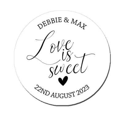 35 Personalised Love is Sweet Wedding Round Stickers. Printed on A4 Sheets - Can be personalised with two names (first names only) and the Date. Lovely finishing touch to your presents. A Lovely way to make your event that extra bit special! Individual sticker size is approximately 3.7 cm. Good quality, professionally designed labels, to make your event a little more MAGICAL! Personalisation Information required: Name of the couple and Date. Each sticker sheet (35 stickers) will be printed with the SAME wording so if you require more than one lot of wording please purchase another sheet. Use 'Customize Now' button, add the personalization you require. Select 'Add to Basket' and then Checkout.