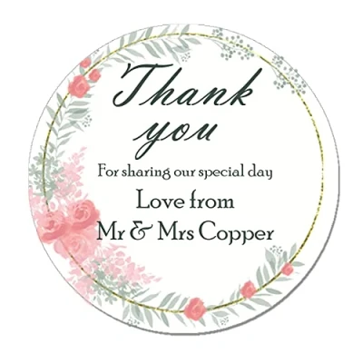 35 Personalised Wedding Round Stickers. Printed on A4 Sheets - Can be personalised with two names (first names only) and date. Lovely finishing touch to your presents. A Lovely way to make your event that extra bit special! Individual sticker size is approximately 3.7 cm. Good quality, professionally designed labels, to make your a little more MAGICAL! Personalisation Information required: Name of the couple. Each sticker sheet (35 stickers) will be printed with the SAME wording so if you require more than one lot of wording please purchase another sheet. Use 'Customize Now' button, add the personalization you require. Select 'Add to Basket' and then Checkout.