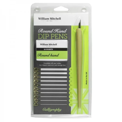 Elevate your calligraphy with the William Mitchell Round Hand Nib Set, a classic choice for both beginners and seasoned lettering artists. This comprehensive set features 10 dip pen nibs in a range of widths, perfect for producing precise, clean lines across a variety of traditional calligraphy styles including Italic and Gothic.. Each nib offers fine graduations in size, allowing for smooth transitions and consistent strokes. The set also includes two slip-on reservoirs for enhanced ink flow, a versatile pen holder, and a handy magnet for easy nib handling. To prepare nibs for first use, simply dip in boiling water briefly to remove the protective lacquer coating.. Key Features:. Includes 10 nibs in varying widths for versatile lettering. Ideal for Italic, Gothic, and other calligraphy styles. Slip-on reservoirs ensure steady ink distribution. Multipurpose pen holder for comfortable writing. Magnet tool for safe and clean nib removal. Set Contents:. Round Hand Nibs: No. 0 (3.7mm), 1 (3.0mm), 1½ (2.4mm), 2 (1.9mm), 2½ (1.5mm), 3 (1.2mm), 3½ (1.0mm), 4 (0.8mm), 5 (0.6mm), 6 (0.5mm). 2 x Slip-on Ink Reservoirs. 1 x Multipurpose Pen Holder. 1 x Magnet. 1 x Sturdy Cardboard Storage Box. Designed with quality and craftsmanship, this set is perfect for exploring calligraphy or expanding your current toolkit.