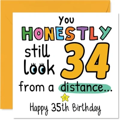 MAKE THEM SMILE WITH THIS UNIQUE BIRTHDAY CARD: This exceptional quality birthday card for him or her shows the design 'You Honestly still look 34 from a distance Happy 35th Birthday'. If you are looking for special birthday greetings cards for Men birthday card then then this happy birthday card is bound to make them smile. Not just for birthday gifts for Men this could also be for Dad, Niece, Son, Wife, Uncle, Cousin, Colleague or Friend. WHAT DO YOU GET: The card is printed on one side and BLANK ON THE INSIDE to allow you to write your very own message. The unique fun design is printed on a specially sourced and environmentally responsible board. At 360 microns thick the natural white one-sided gloss board has a quality look and feel. Supplied with a coloured gummed envelope to complement the design and ready to be sealed and sent in the post. Great Dad birthday cards, Niece birthday card. NO INK SMUDGES: There is nothing worse than writing inside a card to find that the shiny surface makes the ink smudge. This is why we use a high quality one sided coated board. The uncoated side will absorb more of the ink from your pen to make smudging a thing of the past. 35th Birthday card for Son, 35th Birthday card for Wife, 35th Birthday card for Uncle. SIZES: Greeting Card = 145mm x 145mm, Envelope = 155mm x 155mm, Card Thickness = 360 micron. Cousin 35th birthday card, birthday cards for Colleague, special birthday cards for Friend, 35th birthday card Dad, Niece 35th birthday card. MADE AND QUALITY CHECKED IN THE UK: We print and manufacture all our products right here in the UK so you can be sure of a fast turnaround and a product that is expertly made. Using environmentally responsible premium board our card is conscious of the responsible management of the world's forests - perfect birthday cards for Men, fun birthday cards for him, Niece 35th birthday cards, female birthday cards.