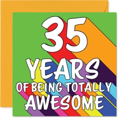 MAKE THEM SMILE WITH THIS UNIQUE BIRTHDAY CARD: This exceptional quality birthday card for him or her shows the design '35 YEARS OF BEING TOTALLY AWESOME'. If you are looking for special birthday greetings cards for Men birthday card then then this happy birthday card is bound to make them smile. Not just for birthday gifts for Men this could also be for Cousin, Sister, Wife, Niece, Daughter, Uncle, Son or Auntie. WHAT DO YOU GET: The card is printed on one side and BLANK ON THE INSIDE to allow you to write your very own message. The unique fun design is printed on a specially sourced and environmentally responsible board. At 360 microns thick the natural white one-sided gloss board has a quality look and feel. Supplied with a coloured gummed envelope to complement the design and ready to be sealed and sent in the post. Great Cousin birthday cards, Sister birthday card. DESIGNED FOR WRITING: There is nothing worse than writing inside a card to find that the shiny surface makes the ink smudge. This is why we use a high quality one sided coated board. The uncoated side will absorb more of the ink from your pen to make smudging a thing of the past. 35th Birthday card for Wife, 35th Birthday card for Niece, 35th Birthday card for Daughter. SIZES: Greeting Card = 145mm x 145mm, Envelope = 155mm x 155mm, Card Thickness = 360 micron. Uncle 35th birthday card, birthday cards for Son, special birthday cards for Auntie, 35th birthday card Cousin, Sister 35th birthday card. MADE AND QUALITY CHECKED IN THE UK: We print and manufacture all our products right here in the UK so you can be sure of a fast turnaround and a product that is expertly made. Using environmentally responsible premium board our card is conscious of the responsible management of the world's forests - perfect birthday cards for Men, fun birthday cards for him, Sister 35th birthday cards, female birthday cards.
