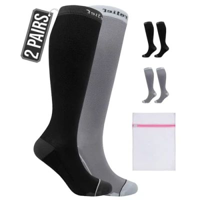360 RELIEF 2 Pairs Compression Socks for Women Men 15 20 mmHg, Circulation Travel Flight Ideal Swollen Legs, DVT, Varicose Veins, Running, Athletic, Cycling, S/M, Black+Grey + Laundry Bag