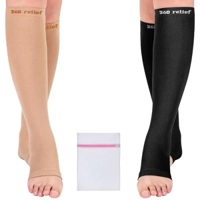 Ideal Support and Comfort: Our medical compression socks (15-20 mmHg) enhance circulation in the legs and feet, helping to alleviate issues like DVT, varicose veins, and discomfort. Designed for optimal leg and foot health, they are perfect for sports trainers and anyone on their feet all day. Pregnancy Relief: Compression socks help reduce swelling during pregnancy by improving circulation and managing the extra body fluid produced. For Active Lifestyles & Work: Whether sitting or standing for long periods, our socks enhance blood flow, reducing the risk of fatigue. Ideal for exercise, running, and preventing cramps and heavy legs. Travel Flight Socks: Clinically proven to improve blood flow, these socks help prevent swollen ankles, ensuring a better flying experience and comfort during long-haul travel. Open-Toe Design: Offers enhanced comfort and breathability, perfect for warm weather and extended wear; provides targeted compression to reduce swelling and improve circulation; versatile fit accommodates various foot sizes without squeezing toes, ideal for daily use during long periods of standing or sitting. Breathable & Lightweight: Made from premium, breathable, and sweat-absorbent material, our knee-length socks are suitable year-round. Includes 2 pairs and a mesh laundry bag. Machine washable. Customer Assurance: We stand by our quality and service. If the size does not fit or you are unhappy for any reason, contact us within 24 hours for assistance
