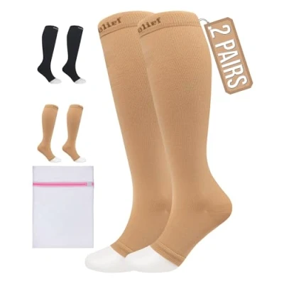 Ideal Support and Comfort: Our medical compression socks (15-20 mmHg) enhance circulation in the legs and feet, helping to alleviate issues like DVT, varicose veins, and discomfort. Designed for optimal leg and foot health, they are perfect for sports trainers and anyone on their feet all day. Pregnancy Relief: Compression socks help reduce swelling during pregnancy by improving circulation and managing the extra body fluid produced. For Active Lifestyles & Work: Whether sitting or standing for long periods, our socks enhance blood flow, reducing the risk of fatigue. Ideal for exercise, running, and preventing cramps and heavy legs. Travel Flight Socks: Clinically proven to improve blood flow, these socks help prevent swollen ankles, ensuring a better flying experience and comfort during long-haul travel. Open-Toe Design: Offers enhanced comfort and breathability, perfect for warm weather and extended wear; provides targeted compression to reduce swelling and improve circulation; versatile fit accommodates various foot sizes without squeezing toes, ideal for daily use during long periods of standing or sitting. Breathable & Lightweight: Made from premium, breathable, and sweat-absorbent material, our knee-length socks are suitable year-round. Includes 2 pairs and a mesh laundry bag. Machine washable. Customer Assurance: We stand by our quality and service. If the size does not fit or you are unhappy for any reason, contact us within 24 hours for assistance