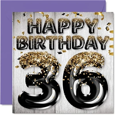 MAKE THEM SMILE WITH THIS AWESOME BIRTHDAY CARD: This exceptional quality birthday card for Him shows the design of black & gold glitter balloons stating 'Happy Birthday 36'. If you are looking for funny birthday cards for Men, then then this happy birthday card is bound to make them laugh. Not just for friendship gifts for Men this could also be for Best Friend, Work Colleague, Dad, Grandpa, Nan, Dad, Grandad, Grandad, Colleague, Brother, Brother, Cousin, Uncle or Uncle. WHAT DO YOU GET: The card is printed on one side and BLANK ON THE INSIDE to allow you to write your very own message. The unique fun design is printed on a specially sourced and environmentally responsible board. At 360 microns thick the natural white one-sided gloss board has a quality look and feel. Supplied with a coloured gummed envelope to complement the design and ready to be sealed and sent in the post. Birthday card for Uncle, 36th birthday card for Him. NO INK SMUDGES: There is nothing worse than writing inside a card to find that the shiny surface makes the ink smudge. This is why we use a high quality one sided coated board. The uncoated side will absorb more of the ink from your pen to make smudging a thing of the past. Best Friend birthday cards, Man's birthday card, birthday card cute, 36th birthday gifts for Men, 36th birthday gifts for Bestie, Cousin birthday cards. SIZES: Greeting Card = 145mm x 145mm, Envelope = 155mm x 155mm, Card Thickness = 360 micron. Great Dad birthday cards from Son or Son, male birthday card, 36th birthday card, happy birthday Friend cards, Friends 36th birthday cards, Cousin birthday card. MADE AND QUALITY CHECKED IN THE UK: We print and manufacture all our product right Him in the UK so you can be sure of a fast turnaround and a product that is expertly made. Using environmentally responsible premium board our card is conscious of the responsible management of the world's forests - Big Brother 36th birthday cards, Friends 36th birthday cards, happy male birthday cards.