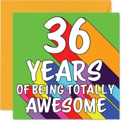 MAKE THEM SMILE WITH THIS UNIQUE BIRTHDAY CARD: This exceptional quality birthday card for him or her shows the design '36 YEARS OF BEING TOTALLY AWESOME'. If you are looking for special birthday greetings cards for Men birthday card then then this happy birthday card is bound to make them smile. Not just for birthday gifts for Men this could also be for Sister, Wife, Niece, Daughter, Uncle, Son, Auntie or Neighbour. WHAT DO YOU GET: The card is printed on one side and BLANK ON THE INSIDE to allow you to write your very own message. The unique fun design is printed on a specially sourced and environmentally responsible board. At 360 microns thick the natural white one-sided gloss board has a quality look and feel. Supplied with a coloured gummed envelope to complement the design and ready to be sealed and sent in the post. Great Sister birthday cards, Wife birthday card. DESIGNED FOR WRITING: There is nothing worse than writing inside a card to find that the shiny surface makes the ink smudge. This is why we use a high quality one sided coated board. The uncoated side will absorb more of the ink from your pen to make smudging a thing of the past. 36th Birthday card for Niece, 36th Birthday card for Daughter, 36th Birthday card for Uncle. SIZES: Greeting Card = 145mm x 145mm, Envelope = 155mm x 155mm, Card Thickness = 360 micron. Son 36th birthday card, birthday cards for Auntie, special birthday cards for Neighbour, 36th birthday card Sister, Wife 36th birthday card. MADE AND QUALITY CHECKED IN THE UK: We print and manufacture all our products right here in the UK so you can be sure of a fast turnaround and a product that is expertly made. Using environmentally responsible premium board our card is conscious of the responsible management of the world's forests - perfect birthday cards for Men, fun birthday cards for him, Wife 36th birthday cards, female birthday cards.