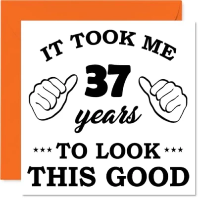 MAKE THEM SMILE WITH THIS UNIQUE BIRTHDAY CARD: This exceptional quality birthday card for him or her shows the design 'It Took Me 37 Years To Look This Good'. If you are looking for special birthday greetings cards for Men birthday card then then this happy birthday card is bound to make them smile. Not just for birthday gifts for Men this could also be for Daughter, Husband, Son, Niece, Auntie, Friend, Colleague or Sister. WHAT DO YOU GET: The cards are printed on both sides with the inside print saying '0' and ample space for your own personal message. The unique fun design is printed on a specially sourced and environmentally responsible board. At 360 microns thick the natural white one-sided gloss board has a quality look and feel. Supplied with a coloured gummed envelope to complement the design and ready to be sealed and sent in the post. NO INK SMUDGES: There is nothing worse than writing inside a card to find that the shiny surface makes the ink smudge. This is why we use a high quality one sided coated board. The uncoated side will absorb more of the ink from your pen to make smudging a thing of the past. 37th Birthday card for Son, 37th Birthday card for Niece, 37th Birthday card for Auntie. SIZES: Greeting Card = 145mm x 145mm, Envelope = 155mm x 155mm, Card Thickness = 360 micron. Friend 37th birthday card, birthday cards for Colleague, special birthday cards for Sister, 37th birthday card Daughter, Husband 37th birthday card. MADE AND QUALITY CHECKED IN THE UK: We print and manufacture all our products right here in the UK so you can be sure of a fast turnaround and a product that is expertly made. Using environmentally responsible premium board our card is conscious of the responsible management of the world's forests - perfect birthday cards for Men, fun birthday cards for him, Husband 37th birthday cards, female birthday cards.