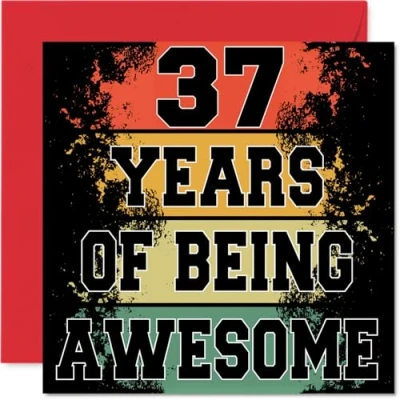 MAKE THEM SMILE WITH THIS UNIQUE BIRTHDAY CARD: This exceptional quality birthday card for him or her shows the design '37 Years Of Being Awesome'. If you are looking for special birthday greetings cards for Men birthday card then then this happy birthday card is bound to make them smile. Not just for birthday gifts for Men this could also be for Wife, Niece, Daughter, Uncle, Son, Auntie, Neighbour or Friend. WHAT DO YOU GET: The card is printed on one side and BLANK ON THE INSIDE to allow you to write your very own message. The unique fun design is printed on a specially sourced and environmentally responsible board. At 360 microns thick the natural white one-sided gloss board has a quality look and feel. Supplied with a coloured gummed envelope to complement the design and ready to be sealed and sent in the post. Great Wife birthday cards, Niece birthday card. NO INK SMUDGES: There is nothing worse than writing inside a card to find that the shiny surface makes the ink smudge. This is why we use a high quality one sided coated board. The uncoated side will absorb more of the ink from your pen to make smudging a thing of the past. 37th Birthday card for Daughter, 37th Birthday card for Uncle, 37th Birthday card for Son. SIZES: Greeting Card = 145mm x 145mm, Envelope = 155mm x 155mm, Card Thickness = 360 micron. Auntie 37th birthday card, birthday cards for Neighbour, special birthday cards for Friend, 37th birthday card Wife, Niece 37th birthday card. MADE AND QUALITY CHECKED IN THE UK: We print and manufacture all our products right here in the UK so you can be sure of a fast turnaround and a product that is expertly made. Using environmentally responsible premium board our card is conscious of the responsible management of the world's forests - perfect birthday cards for Men, fun birthday cards for him, Niece 37th birthday cards, female birthday cards.