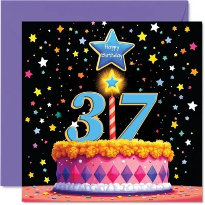 37th Birthday Cards for Women Men Pink Cake & Stars Happy Card 37 Year Old Woman Man Sister Cousin Niece Friend, 145mm Bday Greeting