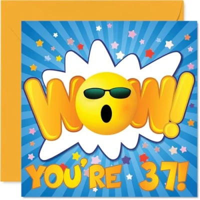 MAKE THEM SMILE WITH THIS UNIQUE BIRTHDAY CARD: This exceptional quality birthday card for him or her shows the design 'WOW Youre 37'. If you are looking for special birthday greetings cards for Men birthday card then then this happy birthday card is bound to make them smile. Not just for birthday gifts for Men this could also be for Wife, Niece, Daughter, Uncle, Son, Auntie, Neighbour or Friend. WHAT DO YOU GET: The cards are printed on both sides with the inside print saying '0' and ample space for your own personal message. The unique fun design is printed on a specially sourced and environmentally responsible board. At 360 microns thick the natural white one-sided gloss board has a quality look and feel. Supplied with a coloured gummed envelope to complement the design and ready to be sealed and sent in the post. NO INK SMUDGES: There is nothing worse than writing inside a card to find that the shiny surface makes the ink smudge. This is why we use a high quality one sided coated board. The uncoated side will absorb more of the ink from your pen to make smudging a thing of the past. 37th Birthday card for Daughter, 37th Birthday card for Uncle, 37th Birthday card for Son. SIZES: Greeting Card = 145mm x 145mm, Envelope = 155mm x 155mm, Card Thickness = 360 micron. Auntie 37th birthday card, birthday cards for Neighbour, special birthday cards for Friend, 37th birthday card Wife, Niece 37th birthday card. MADE AND QUALITY CHECKED IN THE UK: We print and manufacture all our products right here in the UK so you can be sure of a fast turnaround and a product that is expertly made. Using environmentally responsible premium board our card is conscious of the responsible management of the world's forests - perfect birthday cards for Men, fun birthday cards for him, Niece 37th birthday cards, female birthday cards.