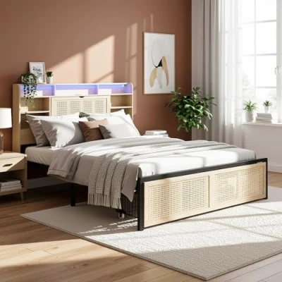 All-in-One Headboard Convenience – Features built-in storage compartments, an LED strip light, and a charging port, keeping your essentials, lighting, and devices within easy reach for a clutter-free bedside experience. Spacious Rattan-Style Drawer – Includes a PE rattan-style drawer on wheels at the foot of the bed, providing smooth-glide, hidden storage for bedding, clothes, or accessories without taking up extra space. Sturdy & Durable Construction – Crafted from premium MDF and iron, this bed frame offers reliable support and long-lasting durability, with a load capacity of up to 180kg. Modern Natural Wood Finish – The warm wood colour and textured rattan accents blend seamlessly with modern, rustic, or classic bedroom décor, adding timeless charm to any space. Easy Self-Assembly – Delivered in two packages with clear instructions and all necessary parts, making assembly straightforward and enjoyable for two people.