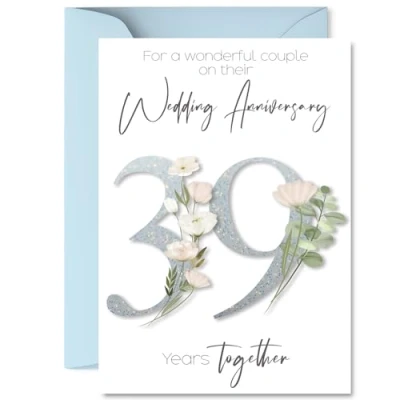 MAKE THEM SMILE WITH THIS ROMANTIC ANNIVERSARY CARD: This exceptional quality anniversary card for her or him shows the design 'For a Wonderful couple on their Wedding Anniversary 39 Years Together'. If you are looking for special anniversary greetings cards for Women anniversary card then then this happy anniversary card is bound to make them smile. Not just for anniversary gifts for Men this could also be for Partner, Wife, Husband, Companion, Boyfriend or Girlfriend. WHAT DO YOU GET: The cards are printed on both sides with the inside print saying 'Have a Lovely Day' and ample space for your own personal message. The unique fun design is printed on a specially sourced and environmentally responsible board. At 360 microns thick the natural white one-sided gloss board has a quality look and feel. Supplied with a coloured gummed envelope to complement the design and ready to be sealed and sent in the post. NO INK SMUDGES: There is nothing worse than writing inside a card to find that the shiny surface makes the ink smudge. This is why we use a high quality one sided coated board. The uncoated side will absorb more of the ink from your pen to make smudging a thing of the past. 39th anniversary card for Husband, 39th anniversary card for Companion, 39th anniversary card for Boyfriend. SIZES: Greeting Card = 148mm x 210mm, Envelope = 150mm x 212mm, Card Thickness = 360 micron. Boyfriend 39th anniversary card, anniversary cards for Husband, cute anniversary cards for Companion, 39th anniversary card Partner, Wife 39th anniversary card. MADE AND QUALITY CHECKED IN THE UK: We print and manufacture all our products right here in the UK so you can be sure of a fast turnaround and a product that is expertly made. Using environmentally responsible premium board our card is conscious of the responsible management of the world's forests - perfect anniversary cards for Men, cute anniversary cards for her, Wife 39th anniversary cards, female anniversary cards.