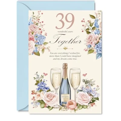 39th Anniversary Card for Women Men Floral Champagne Happy 39 Year Partner Wife Girlfriend Companion, 5x7 Inch Wedding Anniversaries Greeting Cards