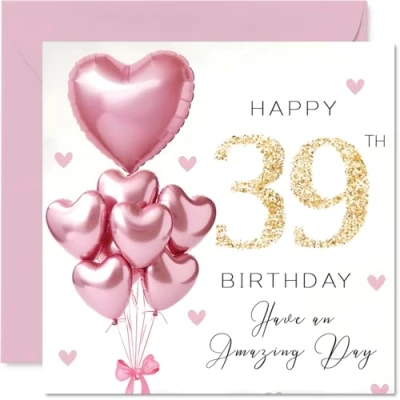 39th Birthday Cards for Women Pink Glitter Balloons Happy Card 39 Year Old Woman Auntie Wife Sister Friend, 145mm Bday Greeting