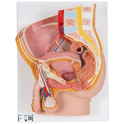 Life-size, median-sectioned human male pelvis model for anatomical study of male pelvis organs Disassembles into two parts for effective demonstration Removable reproductive organs, bladder, and rectum for detailed examination Presented on baseboard, with wall-mounting option for display Made of durable polyvinyl chloride (PVC) plastic for resistance to corrosion 5 years warranty Free access to the exclusive virtual anatomy content of 3B Smart Anatomy. You can now learn all about anatomy online with the virtual version of your model. Download the new and free 3B Smart Anatomy app and start right away to test your knowledge, display your very own AR (Augmented Reality) model, and use the anatomical structure hotspots to study in detail.