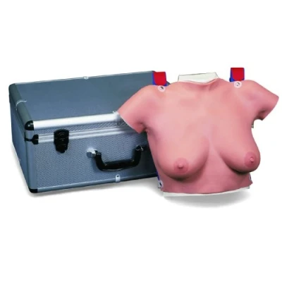Wearable model for demonstrating breast self examination Natural cast of a female upper body with medium-sized breasts Made of silicone for durability and realistic skin texture and detail Strap-around harness for ease of use Stand and aluminium carrying case for convenient storage and transport