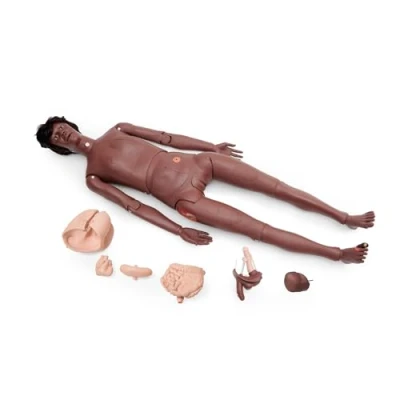 Full-size dark-skin nursing manikin with flexible joints for realistic patient care scenarios. Supports over 20 clinical skills: hygiene, positioning, bed bathing, mouth care, wound dressings, injections, catheterization, enemas and more. Features removable internal organs (stomach, lungs, heart, bladder, intestine) for treatment-care procedures. Includes injection pads, wound inserts, amputation stump, genital models, stoma and internal tubes. Durable, water-resistant plastic body meets NATCEP standards for nursing skills evaluation.