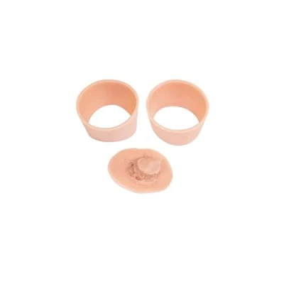 Set of replacement wound covers for the 3B Scientific P102 Hemorrhage Control Arm Trainer. Includes two silicone wound covers for stab and gunshot wounds, plus one for junctional shoulder wound. Covers allow modular scenario setup by hiding wounds as needed during training. Durable silicone covers enable realistic bleeding control drills with wound packing and tourniquets. Lightweight consumable (approx. 50 g) designed for hygiene and easy replacement.