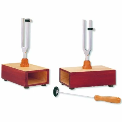 pair of identical tuning forks on resonance boxes assembled for acoustic beats experiments striking hammer and frequency tuning weights included natural frequency 440 Hz