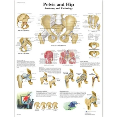This colourful anatomical chart illustrates the anatomy of the human pelvis and hip The poster has useful anatomical information in addition to some of the pathologies of the pelvis and hip This thickly laminated anatomical chart is printed on premium glossy UV resistant paper and comes with 2 sided lamination (75 micron) It comes in a convenient poster size 20" x 26" and this poster can be written on and wiped off with non permanent markers The 75 micron lamination ensures the chart does not curl up at the edges and the UV treatment ensures the chart does not get a faded yellow colour over time