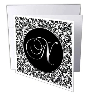 3dRose gc_38763_2 6 x Inch "Letter N Black and White Damask" Greeting Card (Pack of 12)