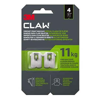 Includes: 4 x 3M claws drywall picture hangers, designed for mirrors, frames and heavy decorations Hardened Steel - Hooks attach securely to drywall. Maximum weight tested - up to 11 kg No tools - just press with your thumbs NO STUDS - Hang your decorations anywhere on a drywall. No regrets - no more big holes in the walls!, Weight: 0.07275254646 Pounds, Manufacturer: 3M