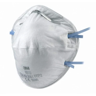 3M 8810 Cup-Shaped Respirator - FFP2 Provides respiratory protection against moderate levels of fine dusts and mists.Additional Information Reliable, effective protection against fine particulates Durable collapse resistant inner shell Excellent fit over a wide range of face sizes provided by convex shape, nose clip and twin-strap design Comfortable, lightweight off-the-face design Blue colour coded straps denoting FFP2 protection level.Standard: EN149:2001 FFP2Approval: CE MarkedMaximum use level: Assigned Protection Factor: 10 x WEL (Nominal Protection Factor 12 x WEL)