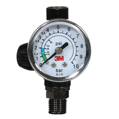 Premium air gauge that allows for smooth operation and high air throughput The customised gauge face allows quick adjustment to desired pressures, displaying both PSI and BAR scales up to 140 PSI / 10 BAR. Gauge is clearly marked at 1.4 bar (20 psi) and 2.0 bar (29 psi), the standard pressures for 3M Performance Spray Gun HVLP and Fine Finish nozzles. Air fitting is 1/4" NPS / 19 BPS hybrid thread For industrial/occupational use only. Not for consumer sale or use
