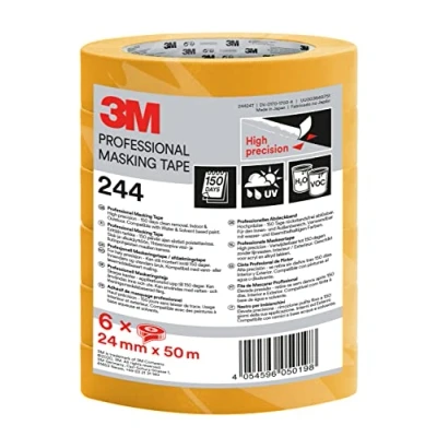 3M Professional Masking Tape 244, Universal Surfaces, Painters Tape, 24 mm x 50 m, 6 Rolls High Precision, UV and Water Resistant, For Indoor & Outdoor