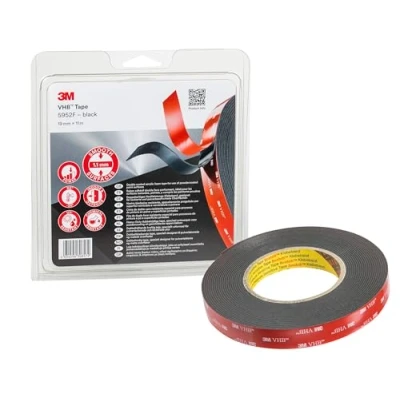 3M VHB 5952F Double Sided Adhesive Tape Provides adhesion to most powder coated paints, metals, glass, sealed wood, acrylic, polycarbonate and ABS 19mm x 11m, Thickness 1.1mm, Black (1 Roll)
