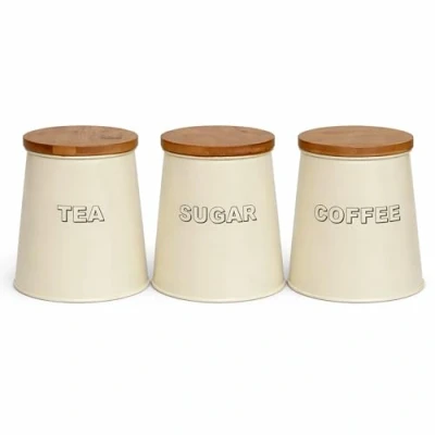 Looking to add a touch of simplistic eye-catching style to your kitchen, then look no further! Our 3PC Tea, Coffee & Sugar canister set delivers style, simplicity and value. Airtight conical shaped metal storage canisters with lids. Available in the neutral multi decor complimenting colour tones of Matt Black or Antique Cream Approx Dimensions: 15cm (H) x 14cm (W) x 14cm (D)