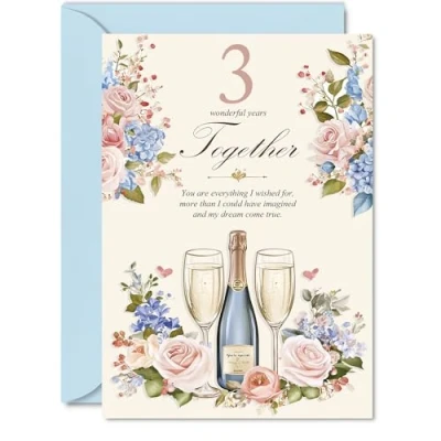 3rd Anniversary Card for Women Men Floral Champagne Happy 3 Year Boyfriend Companion Wife Partner, A5 Wedding Anniversaries Greeting Cards