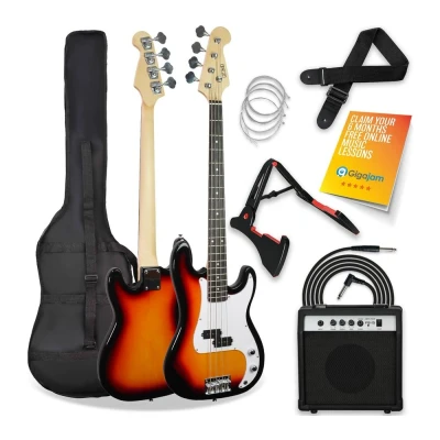 3rd Avenue Full Size 4/4 Electric Bass Guitar Beginner Pack Kit with 15W Amplifier, Bag, Cable, Strap, Stand and Spare Strings Sunburst