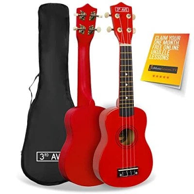 3rd Avenue Soprano Ukulele Beginner 21 Inch 4 Nylon Strings with FREE Uke Bag Red 1 Month Online Lessons