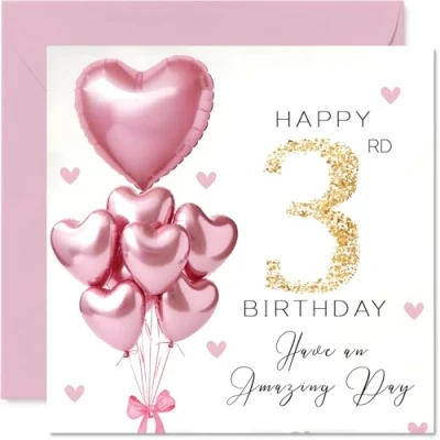 3rd Birthday Cards for Girls Pink Glitter Balloons Happy Card 3 Year Old Girl Step Daughter Granddaughter Sister Daughter, 145mm Bday Greeting