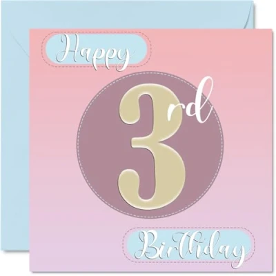 MAKE HER SMILE WITH THIS UNIQUE BIRTHDAY CARD: This exceptional quality birthday card for her shows the design 'Happy 3rd Birthday'. If you are looking for special birthday greetings cards for Girls birthday card then then this happy birthday card is bound to make her smile. Not just for birthday gifts for Girls this could also be for Cousin, Daughter, Granddaughter, Niece, Sister, Goddaughter, Step Daughter or Great Niece. WHAT DO YOU GET: The card is printed on one side and BLANK ON THE INSIDE to allow you to write your very own message. The unique fun design is printed on a specially sourced and environmentally responsible board. At 360 microns thick the natural white one-sided gloss board has a quality look and feel. Supplied with a coloured gummed envelope to complement the design and ready to be sealed and sent in the post. Great Cousin birthday cards, 3rd birthday card, Daughter birthday card. NO INK SMUDGES: There is nothing worse than writing inside a card to find that the shiny surface makes the ink smudge. This is why we use a high quality one sided coated board. The uncoated side will absorb more of the ink from your pen to make smudging a thing of the past. 3rd Birthday card for Granddaughter, 3rd Birthday card for Niece, 3rd Birthday card for Sister. SIZES: Greeting Card = 145mm x 145mm, Envelope = 155mm x 155mm, Card Thickness = 360 micron. Goddaughter 3rd birthday card, birthday cards for Step Daughter, cute birthday cards for Great Niece, 3rd birthday card Cousin, Daughter 3rd birthday card. MADE AND QUALITY CHECKED IN THE UK: We print and manufacture all our products right here in the UK so you can be sure of a fast turnaround and a product that is expertly made. Using environmentally responsible premium board our card is conscious of the responsible management of the world's forests - perfect birthday cards for Girls, fun birthday cards for her, Daughter 3rd birthday cards, female birthday cards.