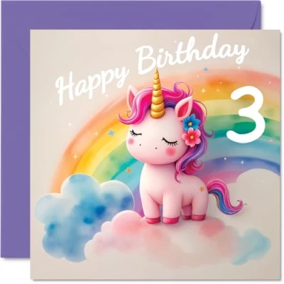 MAKE HER SMILE WITH THIS CUTE BIRTHDAY CARD: This exceptional quality birthday card for her shows the design 'Unicorn in the Clouds'. If you are looking for special birthday greetings cards for Girls birthday card then then this happy birthday card is bound to make her smile. Not just for birthday gifts for Girls this could also be for Goddaughter, Sister, Cousin, Daughter, Niece, Great Niece, Granddaughter or Step Daughter. WHAT DO YOU GET: The card is printed on one side and BLANK ON THE INSIDE to allow you to write your very own message. The unique fun design is printed on a specially sourced and environmentally responsible board. At 360 microns thick the natural white one-sided gloss board has a quality look and feel. Supplied with a coloured gummed envelope to complement the design and ready to be sealed and sent in the post. Great Goddaughter birthday cards, 3rd birthday card, Sister birthday card. NO INK SMUDGES: There is nothing worse than writing inside a card to find that the shiny surface makes the ink smudge. This is why we use a high quality one sided coated board. The uncoated side will absorb more of the ink from your pen to make smudging a thing of the past. 3rd Birthday card for Cousin, 3rd Birthday card for Daughter, 3rd Birthday card for Niece. SIZES: Greeting Card = 145mm x 145mm, Envelope = 155mm x 155mm, Card Thickness = 360 micron. Great Niece 3rd birthday card, birthday cards for Granddaughter, cute birthday cards for Step Daughter, 3rd birthday card Goddaughter, Sister 3rd birthday card. MADE AND QUALITY CHECKED IN THE UK: We print and manufacture all our products right here in the UK so you can be sure of a fast turnaround and a product that is expertly made. Using environmentally responsible premium board our card is conscious of the responsible management of the world's forests - perfect birthday cards for Girls, fun birthday cards for her, Sister 3rd birthday cards, female birthday cards.