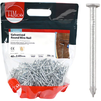 General description Timco Galvanised Round Wire Nails are designed for creating a strong bond between pieces of wood, making them ideal for rough carpentry projects where the nails will not be visible in the finished piece. These nails are suitable for medium duty rust protection and are perfect for clamping applications. Technical specifications Dimensions: 40 x 2.65 mm Weight: 2.5 kg per bag Service Class: Complies with Service Class 2 Eurocode: Complies with Eurocode 5 Other information Available in various sizes: 50 x 2.65 mm, 65 x 2.65 mm, 65 x 3.35 mm, 75 x 3.75 mm, 100 x 4.50 mm, 150 x 6.00 mm Available in different pack sizes: 0.5 kg, 1 kg, 2.5 kg, 25 kg