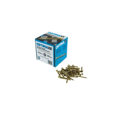 General description OPTIMAXX C288-420 4.0X40 FULL THREAD screws feature a unique design that allows for self-countersinking into various materials without the need for counterboring, ensuring no surface damage. The screws are engineered with a double reinforced collar that enhances strength and prevents snapping, while also allowing for a deeper pozi recess. Technical specifications Dimensions: 4.0 x 40 mm Thread type: Full thread Unique lubricant coating for smooth insertion Razor sharp point angle: 20 degrees Usage These screws are ideal for fast penetration into timber, even without a pilot hole, thanks to their sharp saw tooth formation and specifically positioned long thin groove that minimizes pressure build-up and prevents wood splitting when screwing near edges.