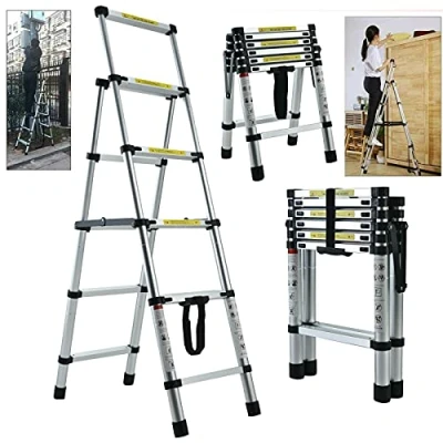 AmazonFeature: Constructed out of high quality corrosion resistant aluminum alloy makes this ladder much heavy duty compact stronger thicker and lighter. 5 steps; net weight about 8.9KG; 2 Ways Use ladder: This ladder you can use as s Single Straight Ladder (1.7M Length) or A-Frame step ladder. With Independent locking system makes extension and retraction much easier; Safety: Non slip rubber at bottom ensure maximum stability and safety when uses. The A-Frame construction provide maximum safety when you climb on it. And the step ladder tested and certified to EN 131; Easy Store: this telescopic step ladder is foldable and portable. So easy for you to store it in limited spaces such as under the bed or the trunk of the car or carry it anywhere you want; Widely Applications: Perfect for house cleaning, decorating, painting, office,market usage Indoor Household use or Outdoor use and other DIY activities;