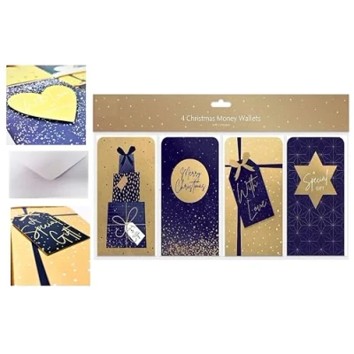 Christmas Money Wallet Gift Cards & Envelopes - Designs: Foil Winters Night Sky Design - 3D greeting embellishment Inside each card there is a space to write who is to and from. You can slot cash, vouchers or gift cards to your loved ones etc Get ready for the festive season with this set of 4 Christmas money wallets. These cash envelopes are perfect for keeping your spare change or gift cards safe and secure. Featuring a cute and traditional design with gold and blue colours, these wallets are ideal for sending to kids or anyone who loves a classic Christmas gift. Ideal for gifting money at Christmas to older kids or adults Gold/Navy colours - 4pk (cards with envelopes)