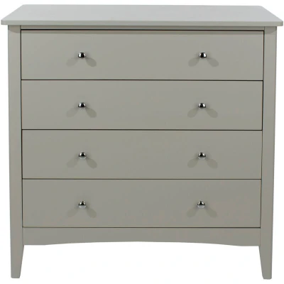 General description This 4 drawer chest features a soft grey paint finish, complemented with tapered legs, real metal handles, and easy glide drawers. It is designed in a modern shaker style, making it a stylish addition to any room. Technical specifications Width: 83 cm Depth: 43 cm Height: 85 cm Installation Easy to assemble