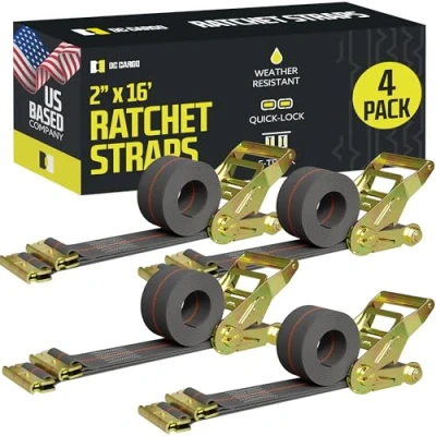 SECURE AND SAFE - These 2" x 16'' Heavy Duty Ratcheting Logistic Cargo Tie-Down Straps have an assembly break strength of 3,000 pounds and a Safe Working Load Limit of 1,000 Pounds. Easily Secure Cargo Loads In Your Box Truck, Cargo Van, Pickup Bed, Flatbed/Utility Trailer, Enclosed Trailer, or Warehouse With The Convenient And Versatile E-Track System; each yellow E-Track strap tie down has E-Track spring fitting attachments at each end that click into slots on your E-Track rails or singles DURABLE - Never replace your straps again! These Ratchet Tie-Down Cargo Straps are made out of durable yellow polyester webbing (strap material) that is water- and UV ray- resistant. They won't shrink or stretch even when wet. The steel ratchet is made to ensure the most reliable trailer and truck cargo securement throughout the bumpiest rides. EASY TO USE - See the image for 6 Easy How-To Steps. 1. Open the ratchet by lifting the lever and threading the loose strap end around the bottom rod of the spindle (ratchet handle) 2. Pull the excess webbing through and pump the strap tight until it is wrapped securely around your cargo load 3. Clip the lever down and your load is secure! PROTECT YOUR PROPERTY - These Tie Down retractable ratchet straps Are Made Out Of The Most Reliable Materials Available With The Highest Standard Workmanship; click the images to see more ways to use these fabulous E-Track Tiedown Cargo Tork Strap Straps for trucks, trailers, vans, sailboats, kayaks, cars, motorcycles, RVs, and other tie down needs USA BASED COMPANY - American Service, American Quality, along with our DC Cargo 100% satisfaction guarantee