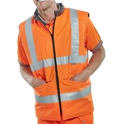 Reversible Hi Vis interactive Bodywarmer PU coating to hi-vis side. Grey polycotton lining on reverse. Heavy duty zip. 2 zipped pockets on both sides. Mobile phone compartment on quilted side. Retro-Reflective tape. Conforms to EN ISO 20471 Class 2 high visibility RIS-3279-TOM - Railway use certified.