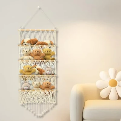 [Material ] The mesh plush toy storage is made of quality cotton rope and wood, hand-woven, delicate and soft, eco-friendly, safe and durable. [Space saving ]The Stuffed animal storage helps keep your child's stuffed animal collection neatly organized and out of the way, freeing up valuable floor space in your home. Great hanging toy organizer for kids playroom bedroom. [Help You Find] Due to the elastic rope design, it will not block your sight, and you can find what you want quickly. [Wide Use] The plush toy storage net is great for storing small stuffed animals, books, magazines, balls, small toys, small items, etc. [Beautiful] The stuffed toy storage hammock is designed with tassels, wooden beads and braided patterns, sturdy and beautiful, you can use it as a display wall to store your kid's toys, make the room neat and unique