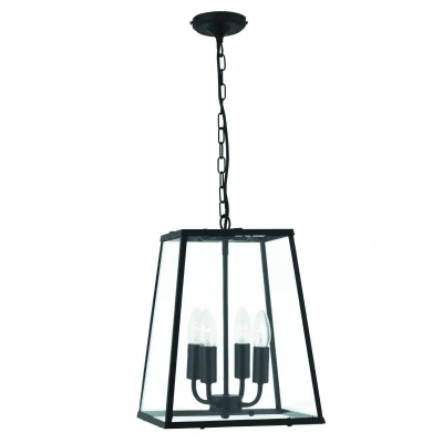 4 Light Ceiling Lantern Pendant Matt Black, Glass Panels, E14