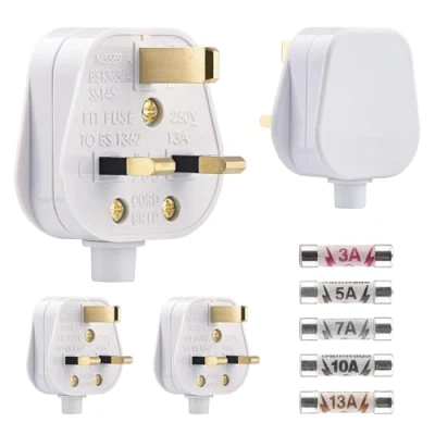 4 Pack 3 Pin Plug UK 13 Amp Plugs White Fused Mains with 3A 5A 7A 10A 13A Domestic Fuses Kit