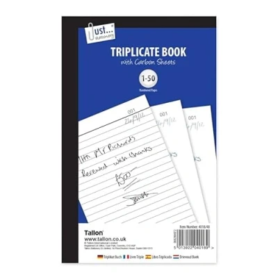 Pack of 4 Triplicate Book 1 - 50 Ruled Pages with Carbon Sheets. A5 148 x 210 mm (15x21cm) Size Invoice Triplicate Receipt Book Numbered 1-50 ruled pages with Carbon Sheets. Microperforated top copy for easy removal with a clean edge. Top copy perforated for easy removal on left hand edge whilst bottom two copy remains in the book. Stitched and bound with tape for a traditional finish. This is a brilliant invoice pad. The benefit is that a copy is made for the customer and 2 duplicate copies are left in the book. Triplicate invoice book is suitable for gardening business, trade, home and office use, and also best for other small businesses. Mostly uses in stores or on stalls at fairs or markets. Ideal for daily use.